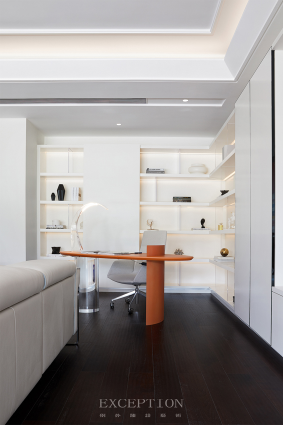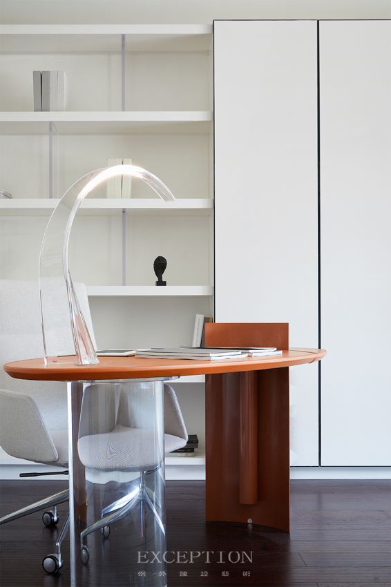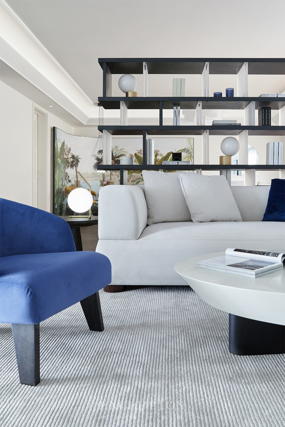 沙發(fā)背后以開放式書架作為隔斷,豐富空間動(dòng)線與層次感,而亞克力材質(zhì)的嵌入將空間映襯得更為朗闊清亮。空間整體在現(xiàn)代中又透露出藝術(shù)的風(fēng)貌,純粹之余又擁有璀璨的焦點(diǎn)。