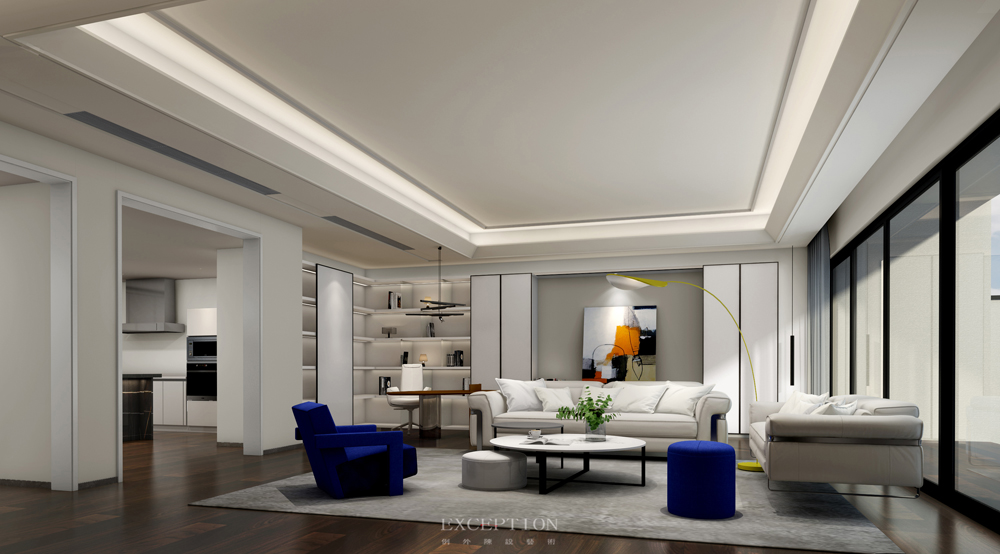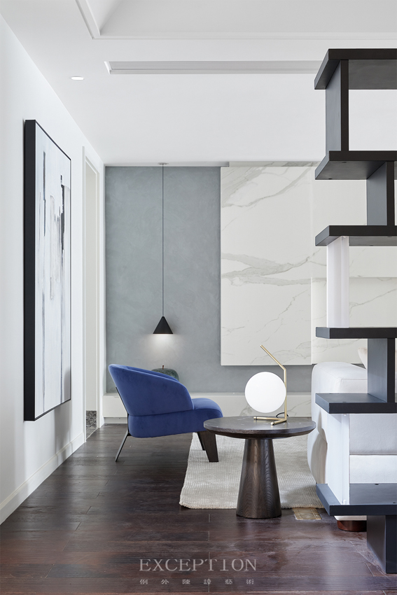 休閑廳以乳白的干凈簡(jiǎn)雅作為基底,間以普魯士藍(lán)的優(yōu)雅調(diào)動(dòng)空間氛圍,一幅抽象主義的藝術(shù)掛畫引起觀者無限的想象。