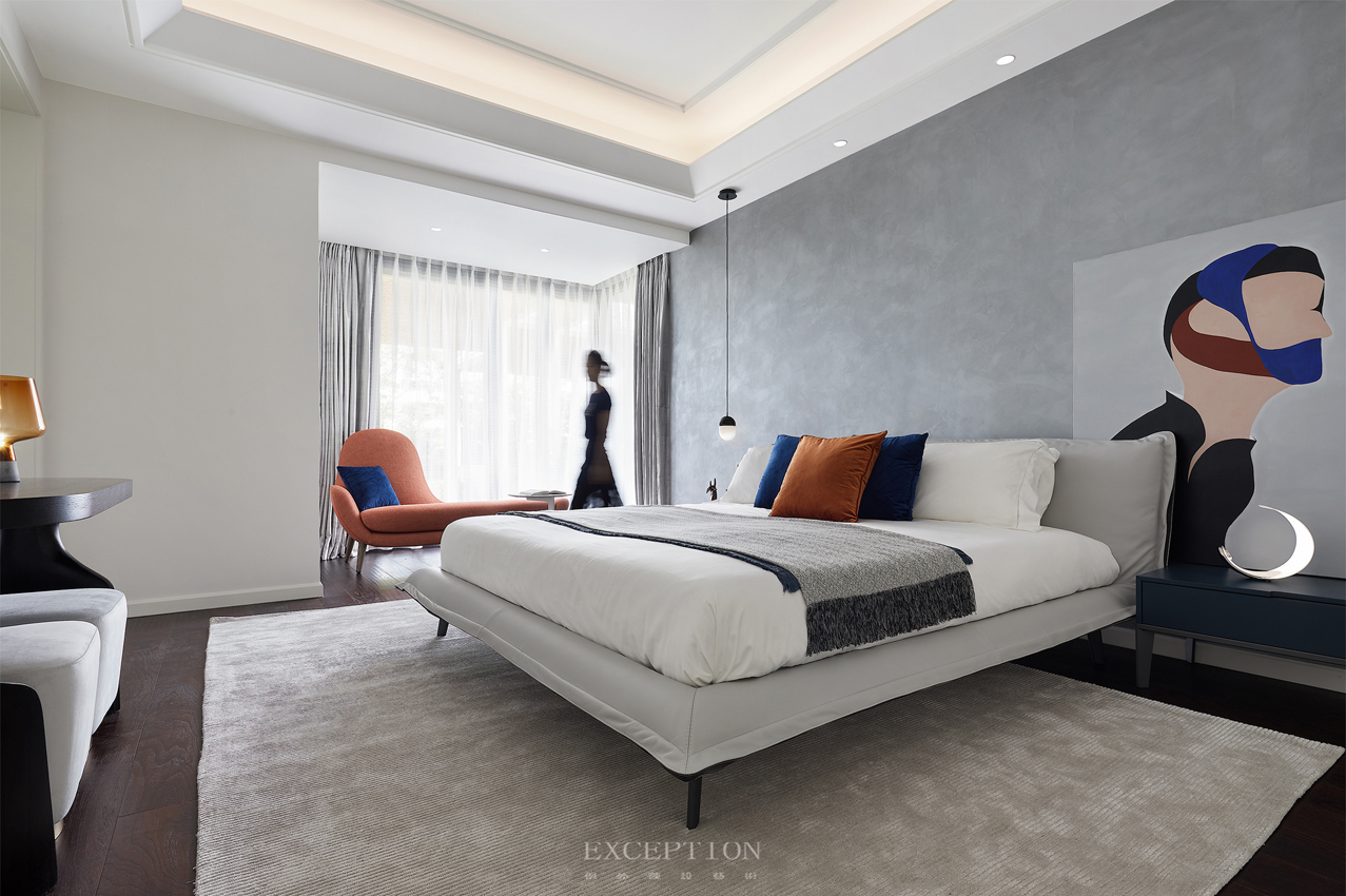 全明落地窗納入窗外四季風(fēng)光意景,普魯士藍(lán)與沙橘色的配搭使得主臥空間顯得更有精尚且優(yōu)雅的藝術(shù)視像,加上現(xiàn)代極簡(jiǎn)形制的家具相映互搭,不僅描摹出空間簡(jiǎn)而溢美的觀感,亦呈現(xiàn)了設(shè)計(jì)師在材質(zhì)與品質(zhì)細(xì)節(jié)上的把控與專業(yè)。