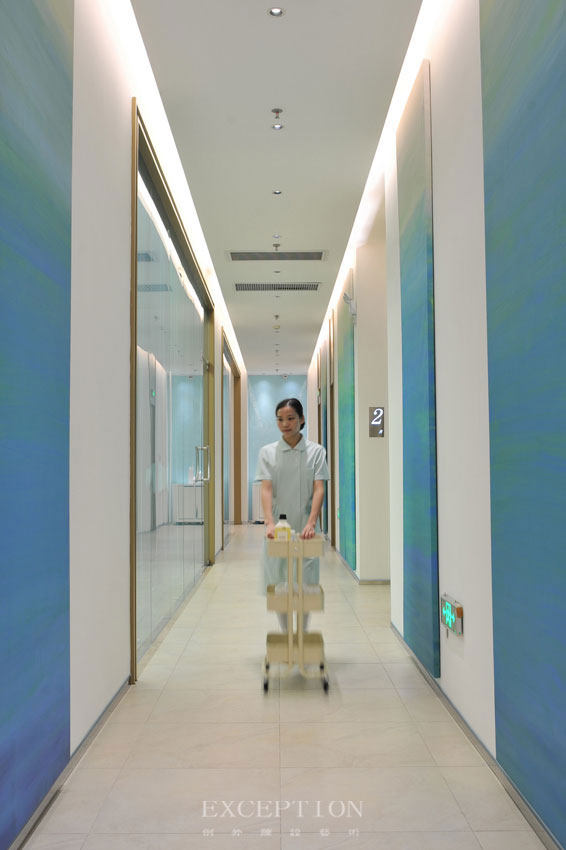 有人說,美,是尋找一種平和。對稱設(shè)立的隱藏光帶實是設(shè)計師在空間中不斷探討的平衡法則,以此傳遞出沉靜穩(wěn)妥的安全之感。單調(diào)的白色墻壁未免過于冷清慘淡,于是巧用硬包版畫進(jìn)行裝飾,當(dāng)溫潤的藍(lán)漫延過整條走廊,仿佛漸變的天空般澄澈爽朗。