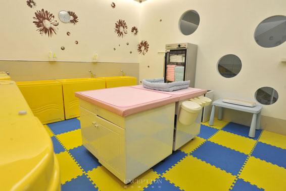 鮮艷的色彩對新生兒有一種強(qiáng)烈的吸引力,能夠刺激新生兒對色彩的辨識能力,設(shè)計師選取檸檬黃和天空藍(lán)作為嬰兒游泳撫觸室的主色調(diào),貼近自然的顏色把空間裝點得空間活潑清爽,圓潤的家私邊角處理貼心的避免了磕碰危險,保障新生兒安全。