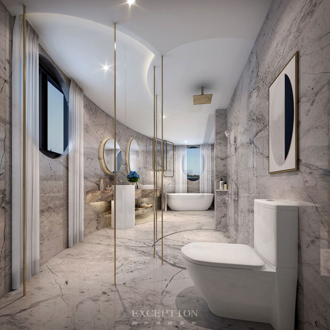 主衛(wèi)延續(xù)圓的意蘊,圓形窗、鏡賦予空間更開闊的視野,弧形隔斷再現(xiàn)了太極的神韻,一開一合間,臨摹出一派舒適自在。
