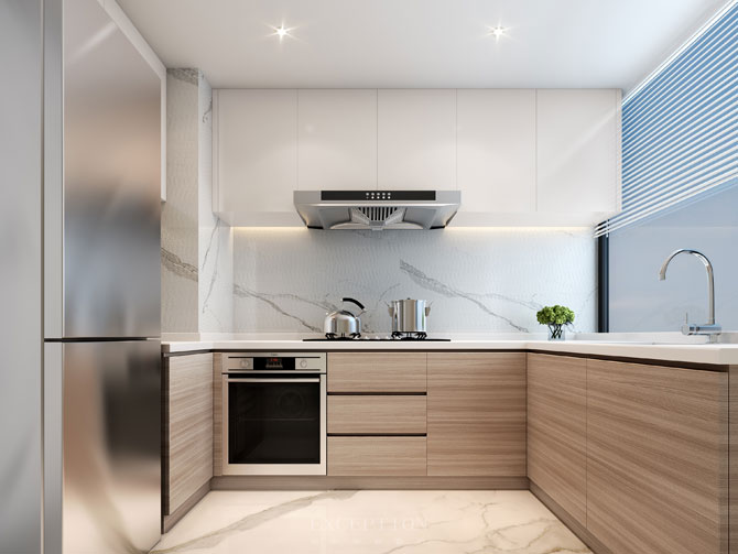 廚房主要著力點(diǎn)在色彩的選擇上,運(yùn)用純潔明亮的白色,從視覺上營造通透的空間感。