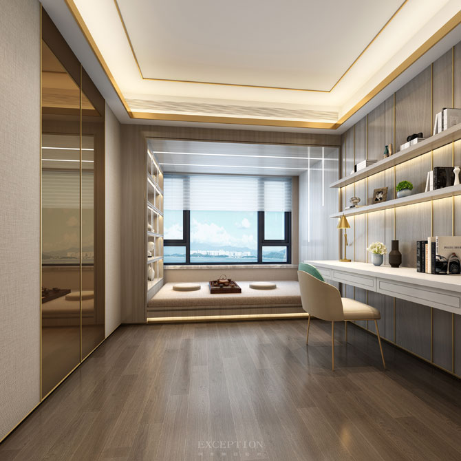 多功能房延續(xù)了線型的設(shè)計,窗前線型透光片呼應(yīng)了墻面的木飾面,與對面簡潔平整的柜子形成鮮明的對比。