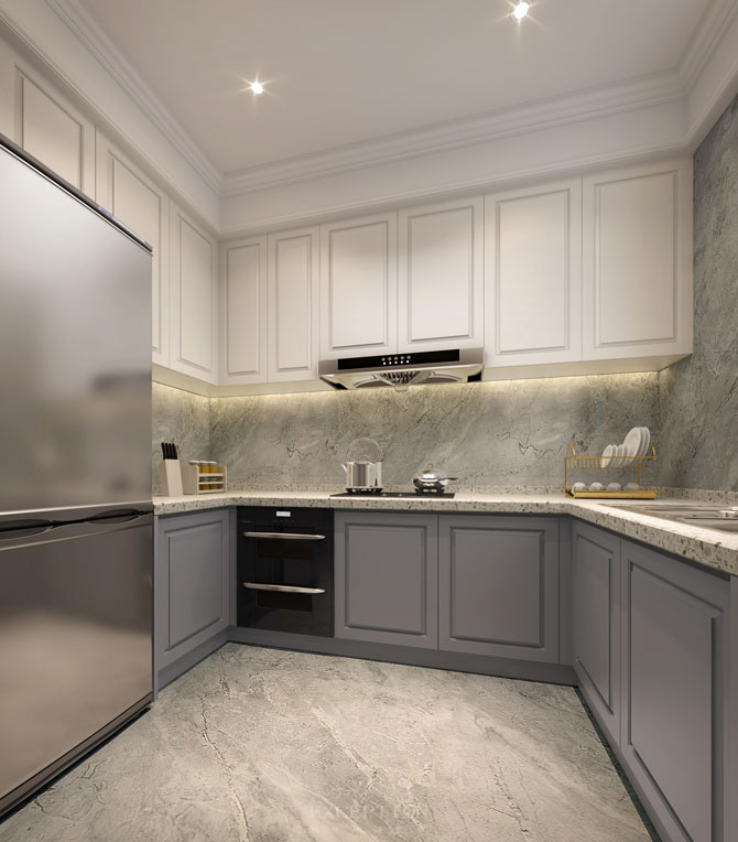 廚房以穩(wěn)重大氣的灰白創(chuàng)造出干凈整潔的情境,陽光融入的午后,食物咕嚕烹煮升騰起的香氣在方寸之間將從美食里獲取的幸福無限放大……