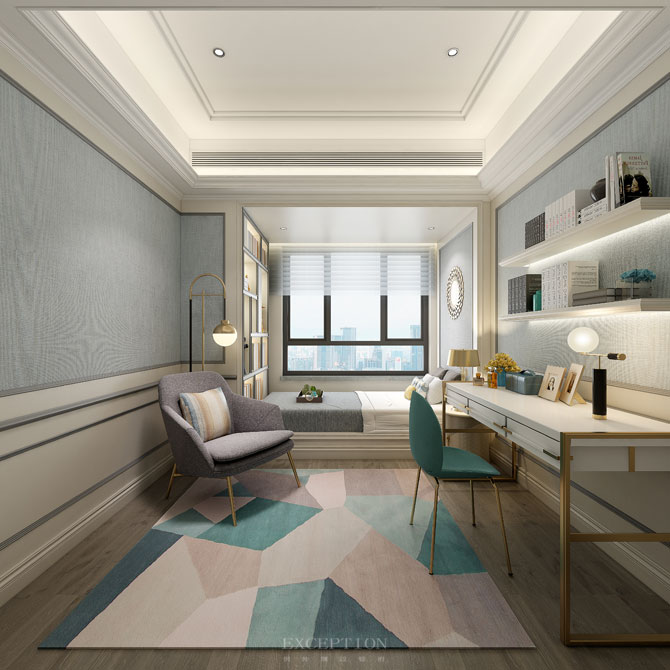 多功能房通過轉(zhuǎn)角造型的設(shè)計創(chuàng)造出一個安靜的閱讀角,幾何拼接的地毯增加了空間的靈動性,金屬邊框元素的融入,不喧嘩,卻成就了空間的品位。