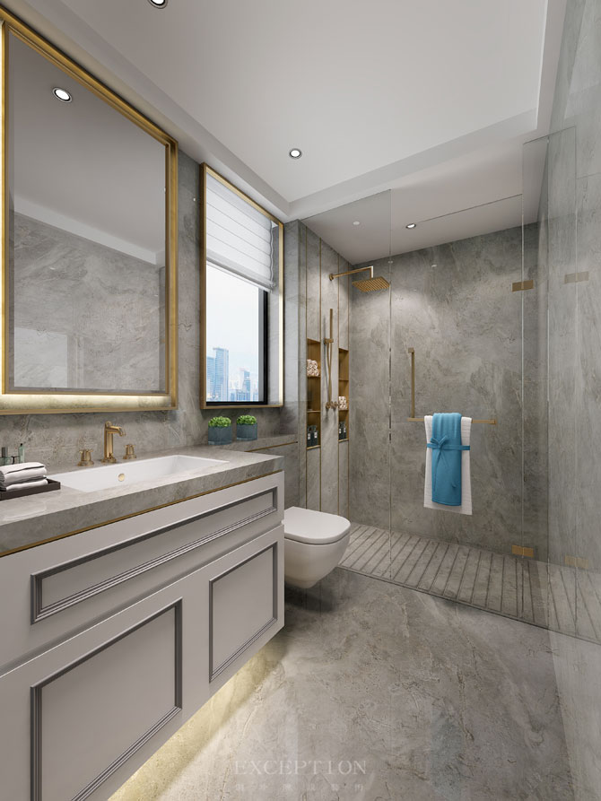 衛(wèi)生間以灰色大理石為基礎(chǔ),沉穩(wěn)大氣,同等大小的浴室鏡平衡原有窗戶的限制,空間更加和諧立體,壁龕依舊是金屬元素鋪就,整個空間似一幅精致的畫卷,在水汽氤氳的夜晚徐徐展開。