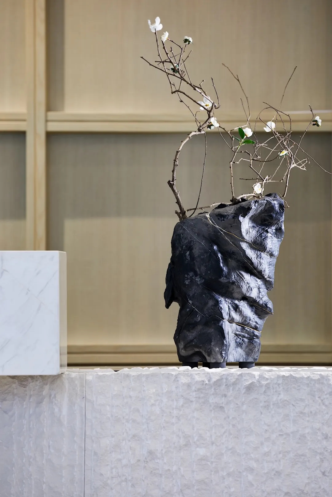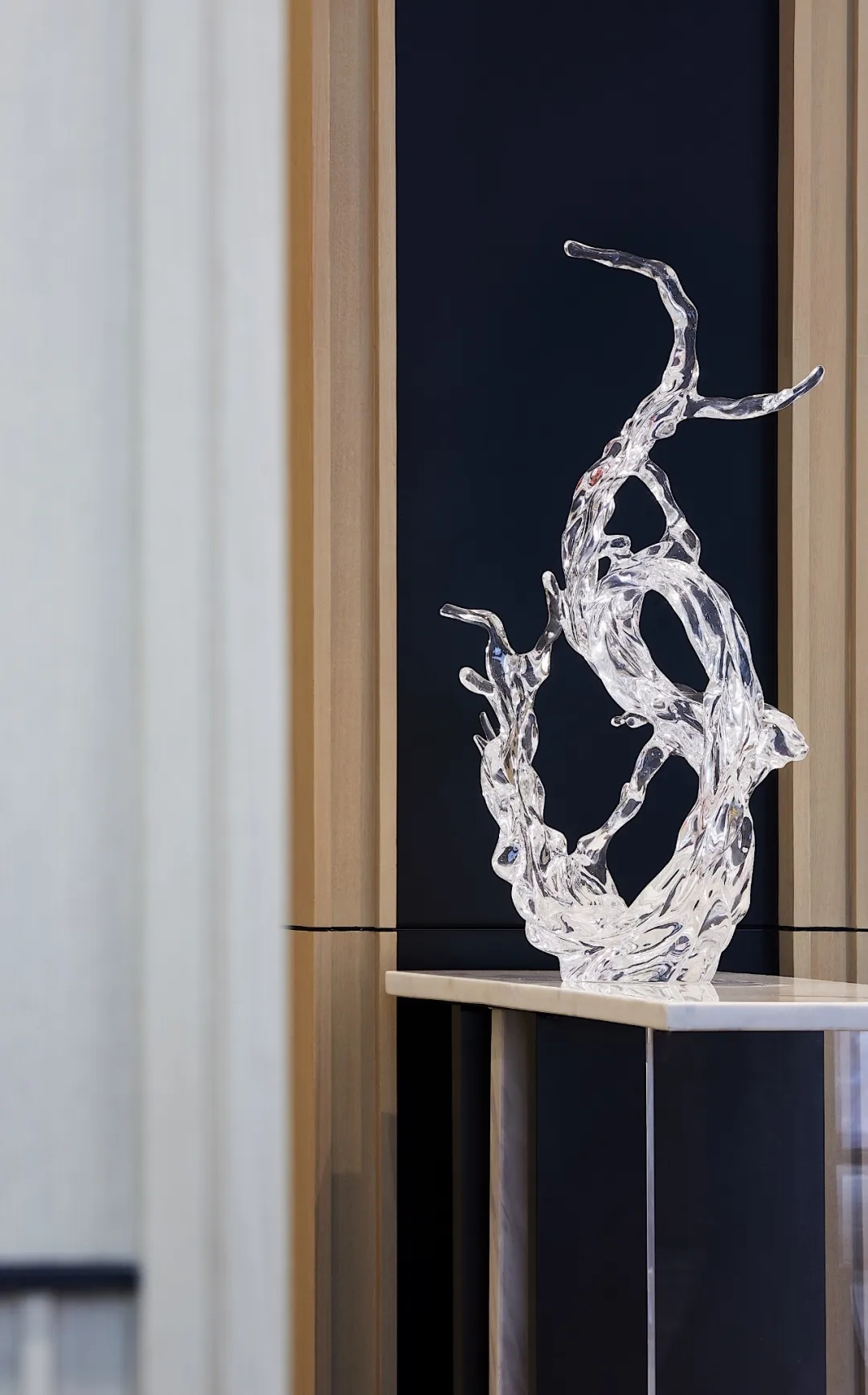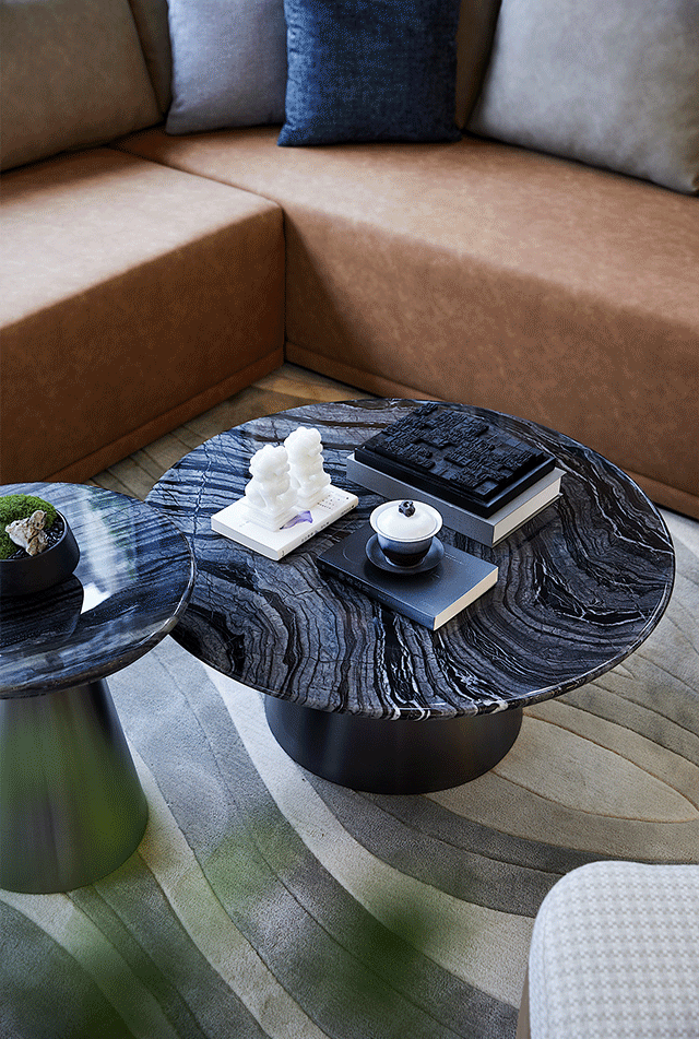 宛如湖景的碧色,與幾何線條的錯落鋪排相融相生。一旁裝點的玻璃藝術品,以水花的柔美卓姿,寫意清透雅澹的意韻??臻g在自然人文語素與現(xiàn)代極簡形制的融合中,剛柔并蓄。
