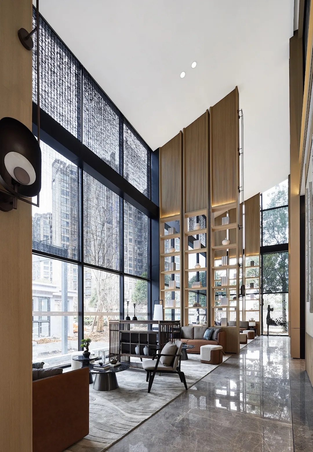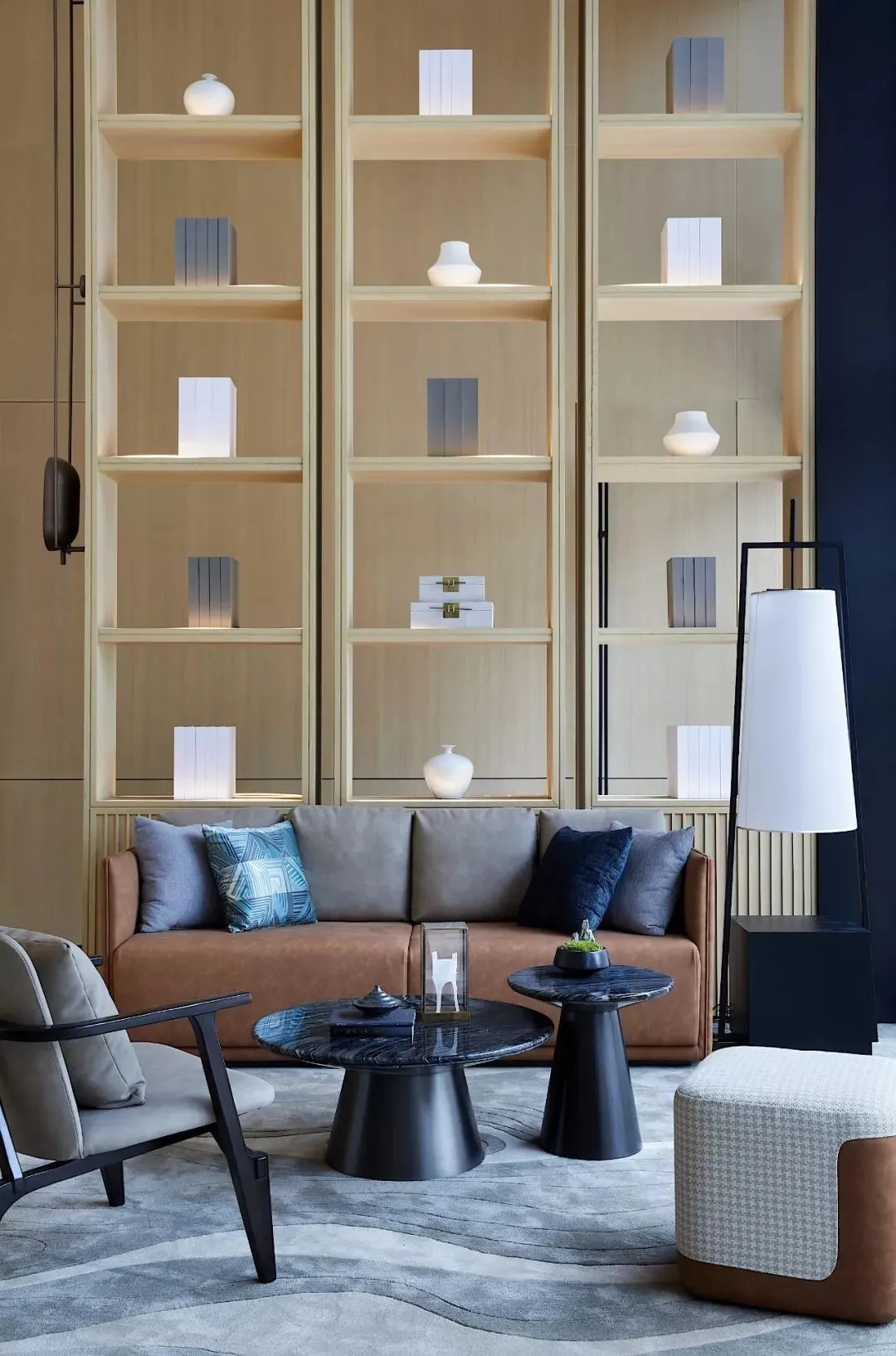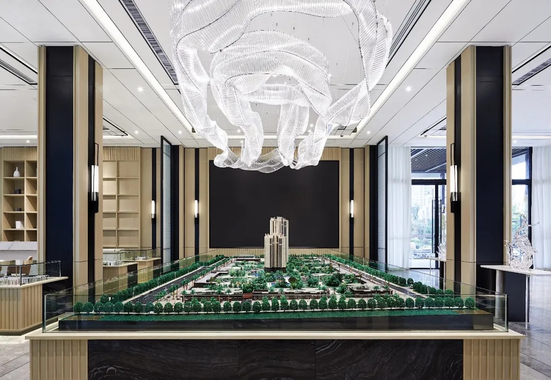 沙盤區(qū)的藝術吊燈,如云霧落入空間,又似漣漪圈圈散開,設計以現(xiàn)代手法演繹出山川自然的曠遠與靈性、清幽與意趣,恰有一番“夫唯不爭,而眾美紛至沓來”的祥和靜氣之感。
