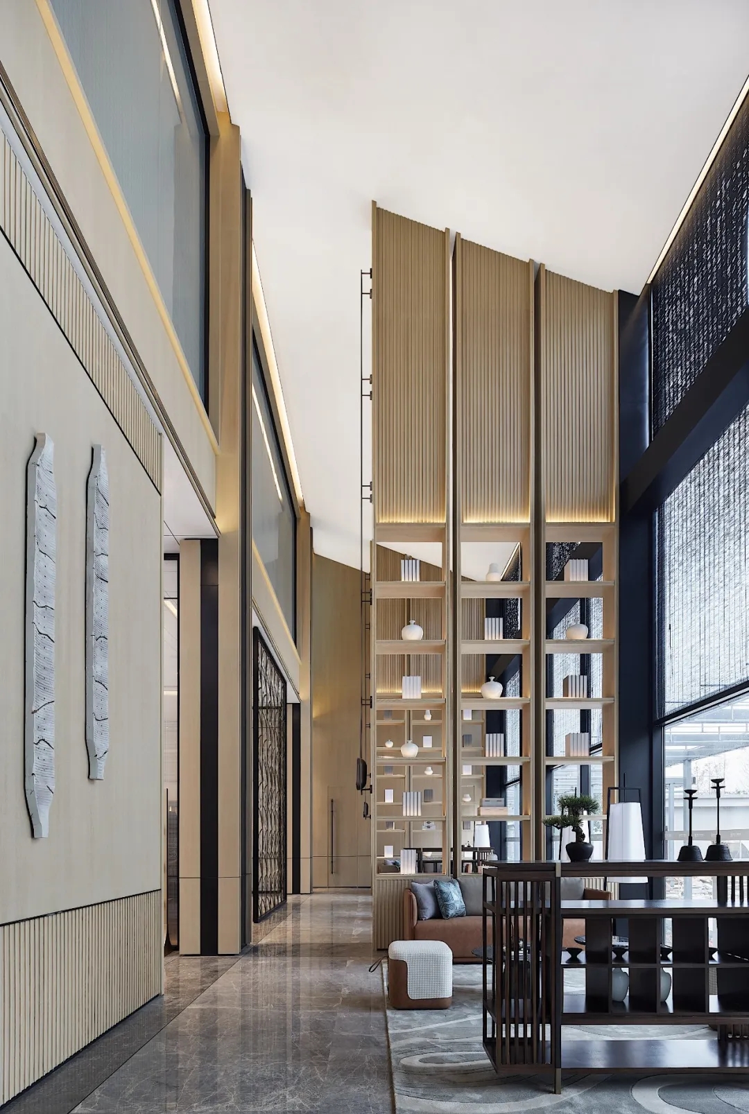 設計以暖調的木色統(tǒng)籌,縈繞其間的氛圍是美好而富有溫情的。墻上的掛件如扁舟淌水,窗旁的雨簾疏密有致,通高的木制書架銜接建筑天花形態(tài),縱向拉伸視覺效果。在這方雅座上沏杯清茶迎接來客,一同感受高雅曠達的自然人文情感。