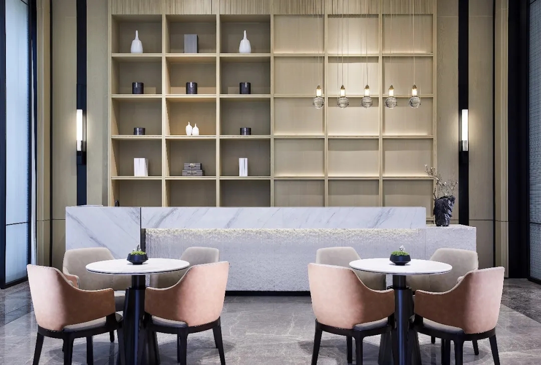 水吧區(qū)以粗糲與光滑相銜的材料搭建,材料豐富的表現(xiàn)力與層次感,在簡雅的環(huán)境背景中被發(fā)揮到了極致?;诳臻g比例、功能使用、美學營造等考慮,鴻藝源在設計中規(guī)避不必要的繁冗雜飾,只以數(shù)只清雅的瓶樽、輕盈的水晶吊燈與清冽的小處盆景裝點,恰如這座城市予人的感覺一般,含蓄悠遠,閑適怡人。