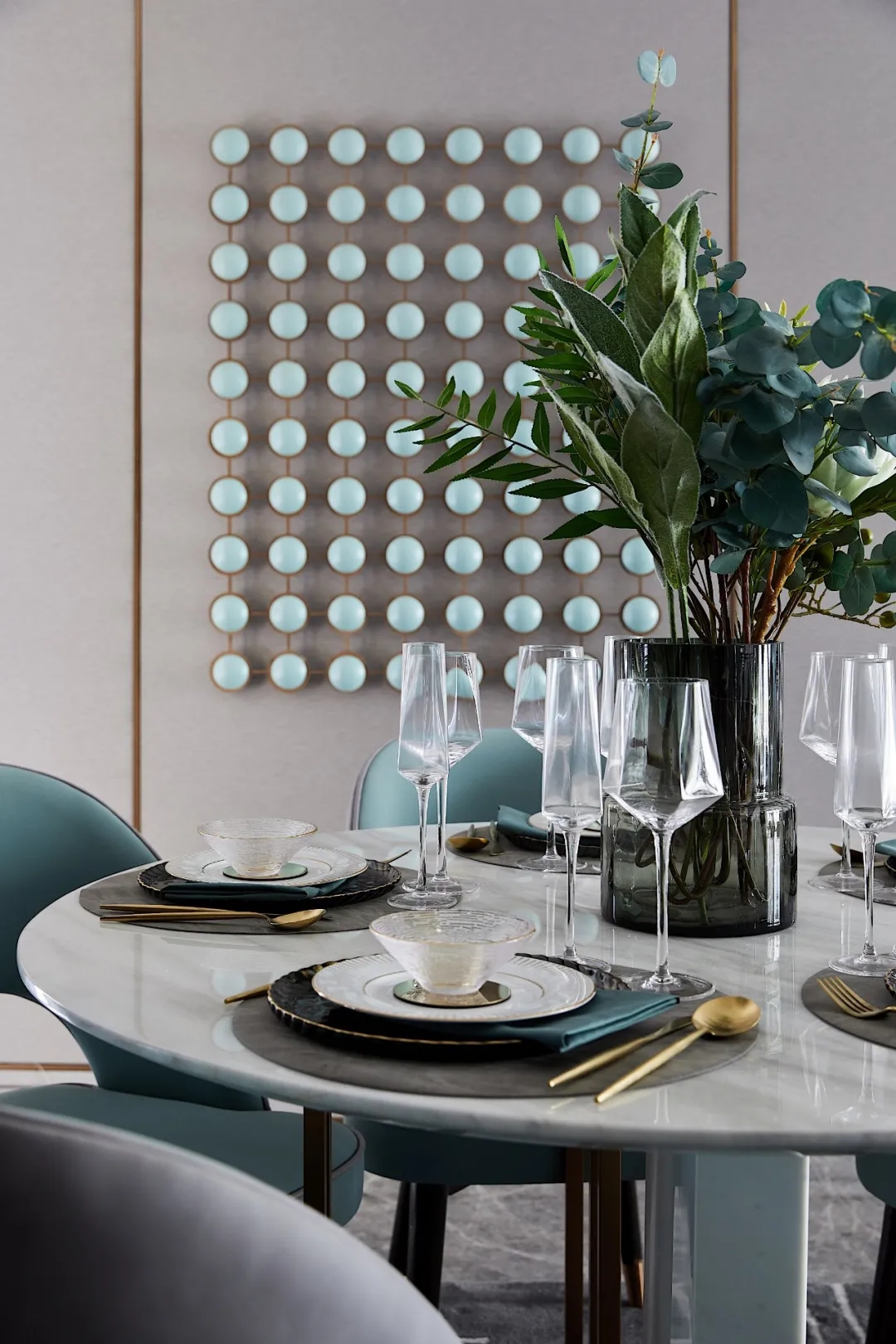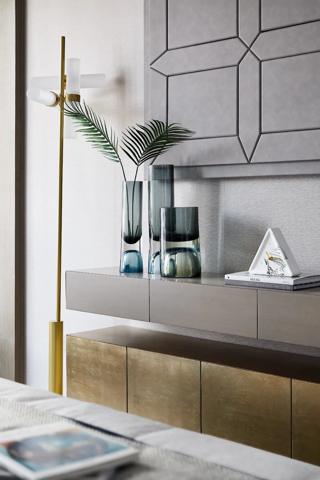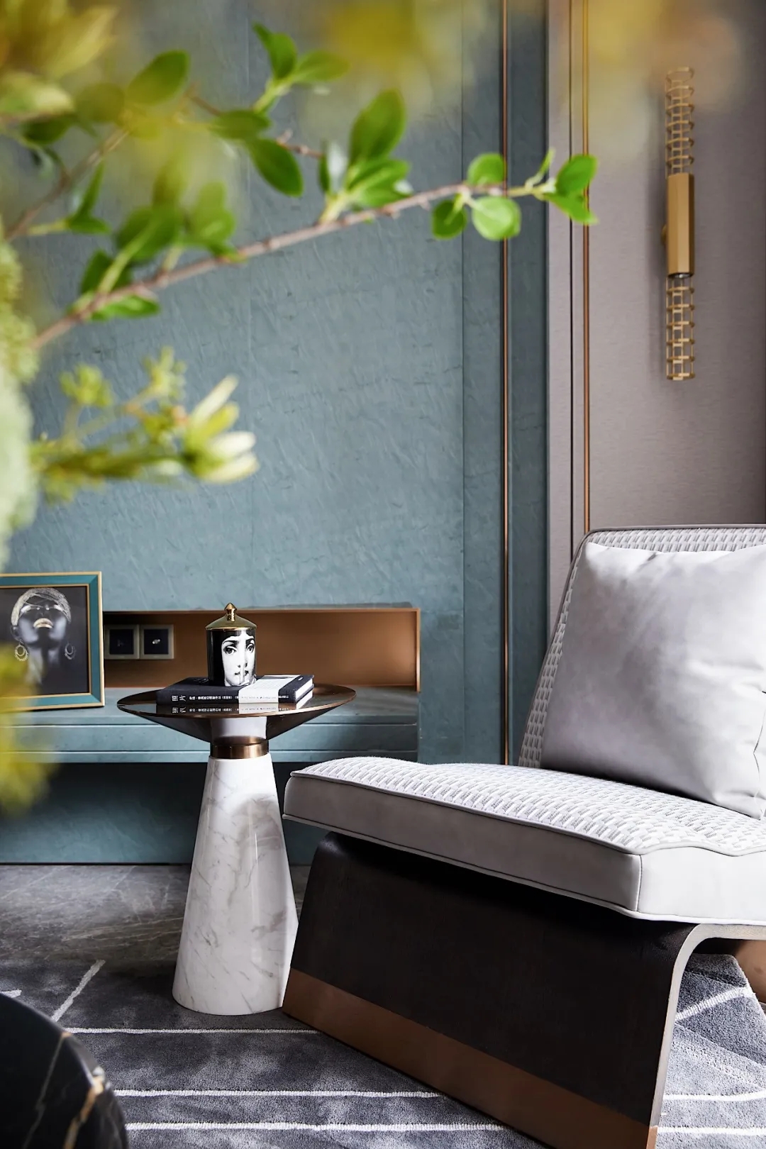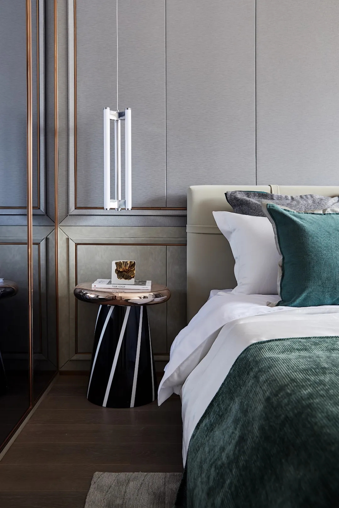 空間中溫文爾雅的色系、質(zhì)感柔軟的床品、清透的樽瓶擺設(shè),鋪敘出如湖畔光景般的閑靜感受。久居城市的喧囂被吹散于腦后,人與自然的距離在此間愈來(lái)愈近,生活的美好圖景在此刻展現(xiàn)得淋漓盡致。