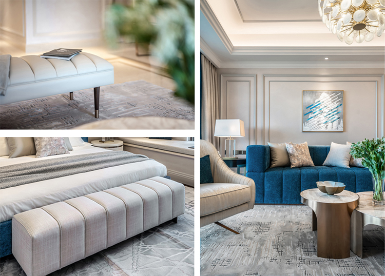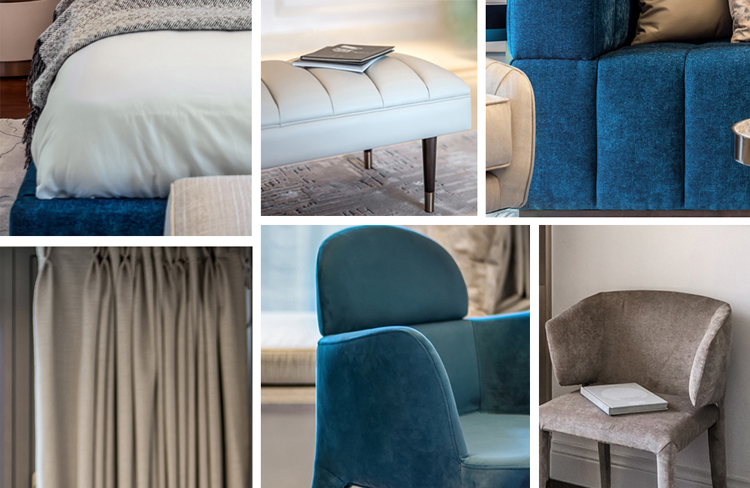 家具家私等采用拉扣工藝,例如客廳沙發(fā)、條凳、餐椅、主臥床具等,增加了細(xì)節(jié)性,同時(shí)也豐富了空間的層次感。
