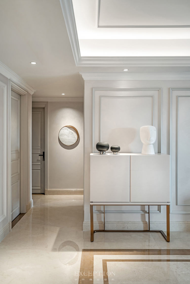 1、設(shè)計(jì)擯棄繁復(fù)冗雜、陳舊突兀的歐式大馬士革墻面元素,以簡約干凈的灰白鋪陳出空間的底色,以金色為筆,勾勒出輪廓的精致輕奢。同時(shí),在家私的光澤與肌理中充盈質(zhì)感。