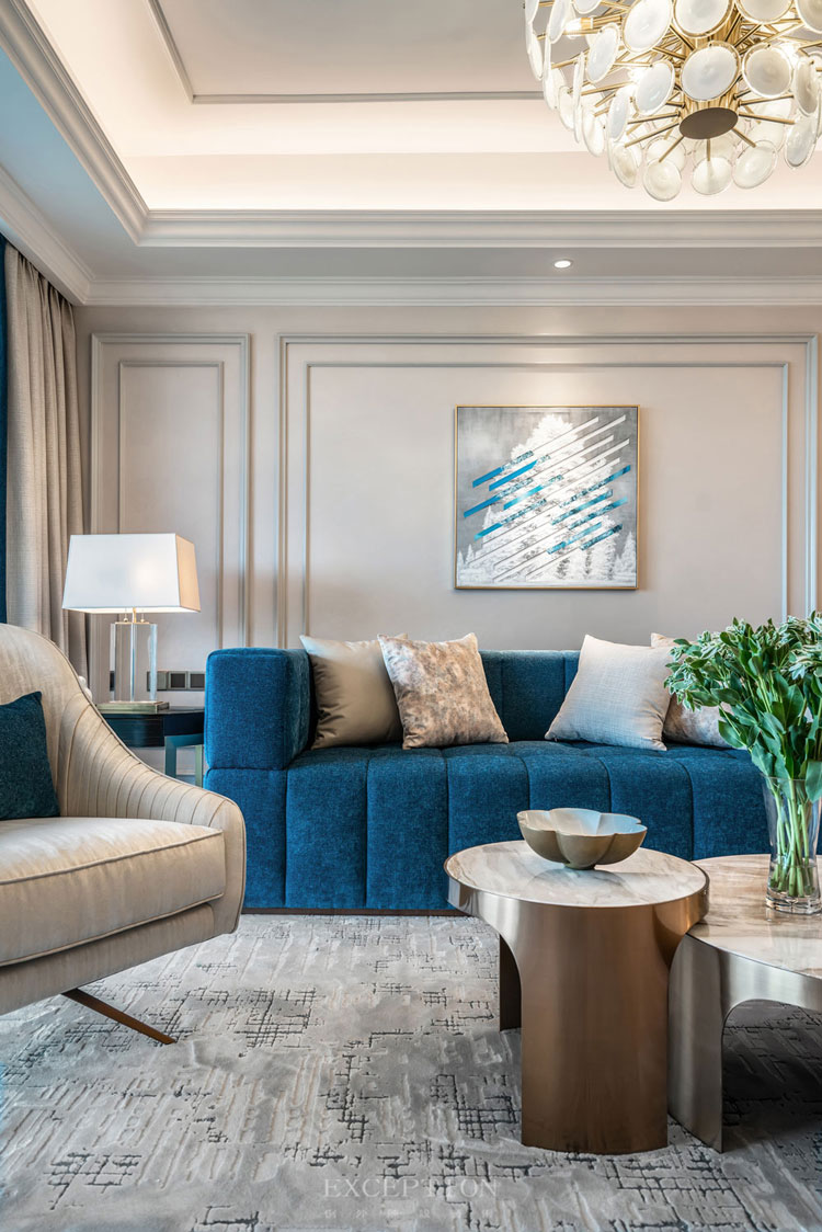 配色:米白色、淺咖色、藍(lán)色、白色、金屬色。寶藍(lán)對(duì)于空間尊貴感的營造功不可沒,純凈的白色、品質(zhì)感的金屬色,讓空間充滿低調(diào)奢華的美感。
