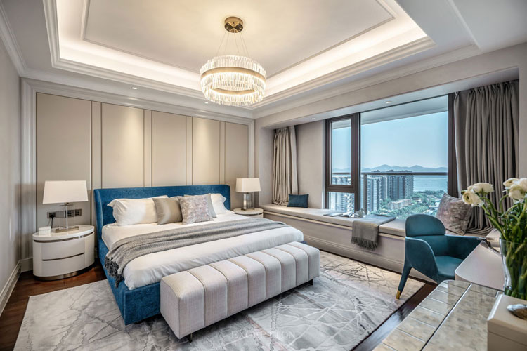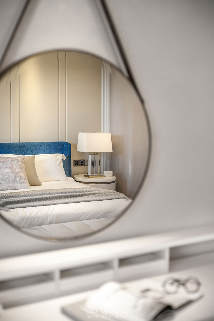 謐靜舒適的藍(lán)延續(xù)到主臥,與一襲素色床品不期而遇,不喧嘩卻獨(dú)具格調(diào),恰如藝術(shù)與生活的完美邂逅。設(shè)計(jì)將生活的質(zhì)感美學(xué)毫無保留地呈敬,貝殼白邊柜閃耀星星點(diǎn)點(diǎn)的光暈,訴說著愜意舒朗的生活情狀,個(gè)性圓鏡映照出伊人純真的模樣,窗外城景入畫,豐盛室內(nèi)精彩生活。