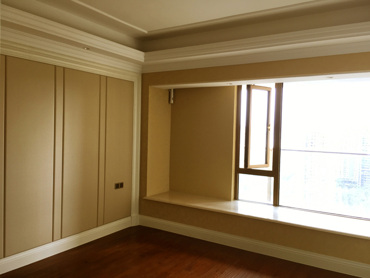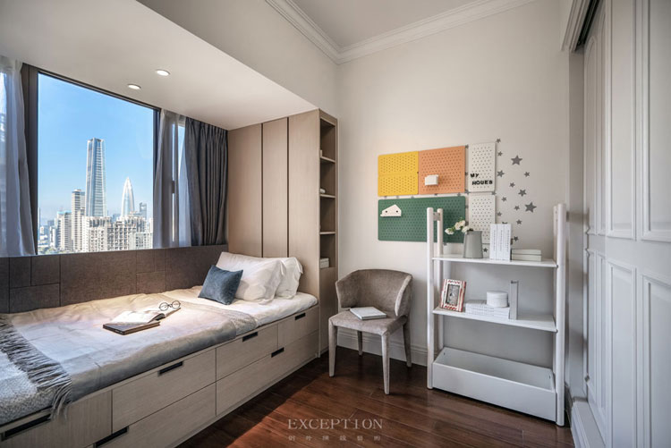 3、兒童房飄窗在原有基礎(chǔ)上設(shè)計(jì)了儲(chǔ)藏柜,增加了收納功能。同時(shí)用純色的藝術(shù)涂料取代了不太和諧的墻面硬包。