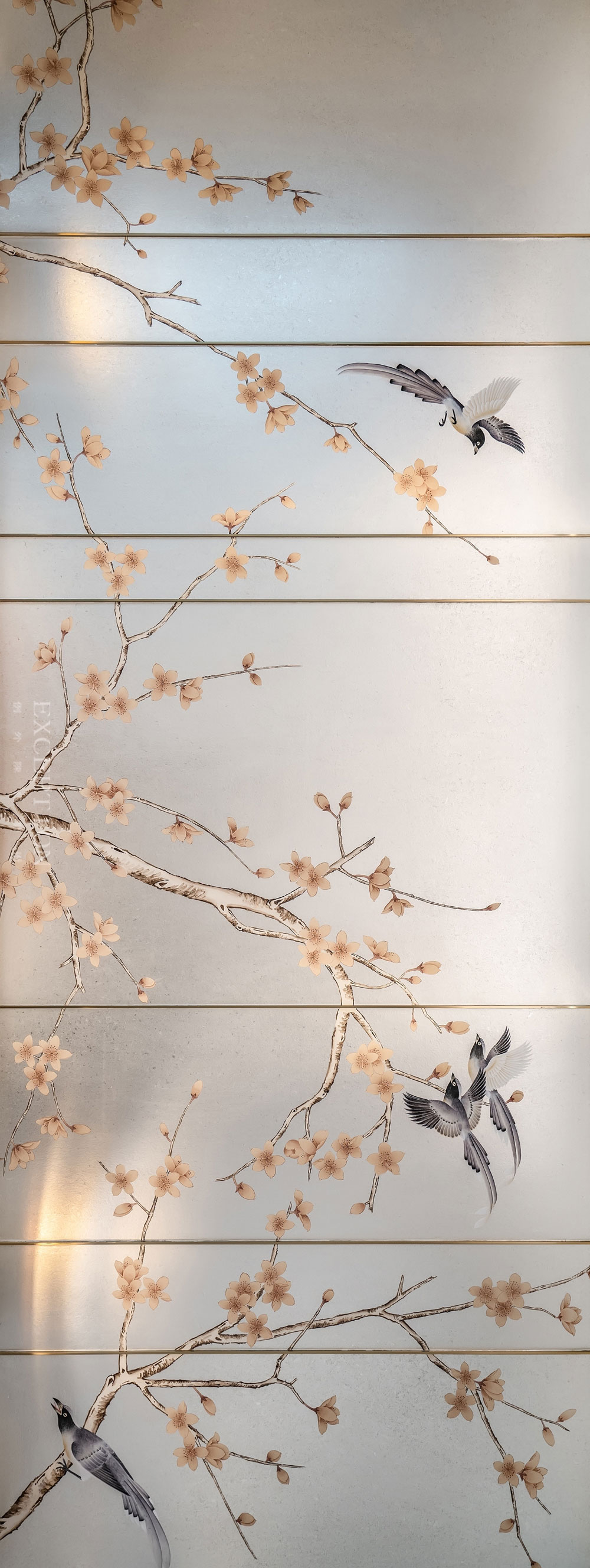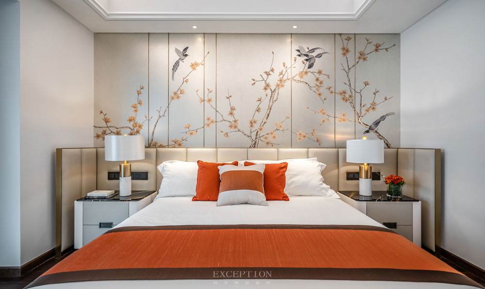 猶如一支曲子的高潮部分,花開滿枝頭,雀鳥盼人歸。傳統(tǒng)的花鳥悠閑地在銀箔材質(zhì)的背景墻上縱情盛開、歌唱,與同色系的床品不謀而合,明麗爛漫。每一處細(xì)節(jié)都在展示對理想生活的美好期待。