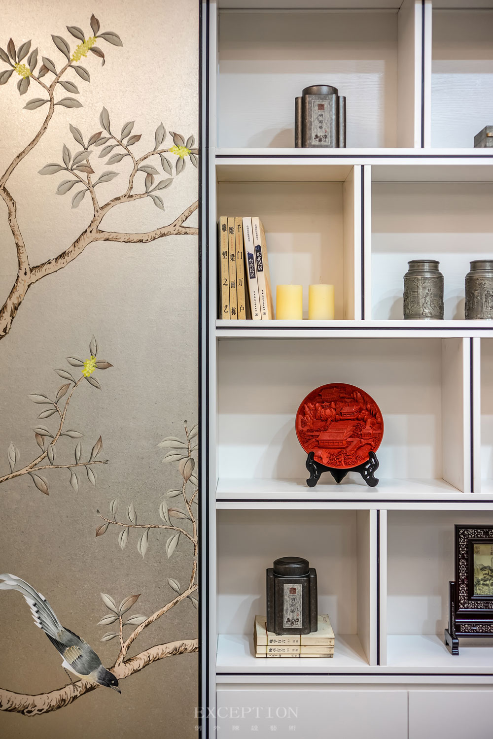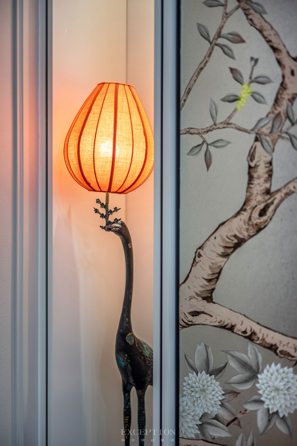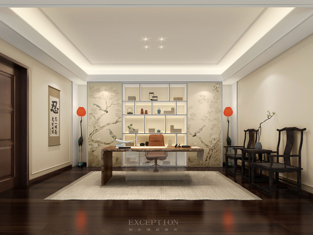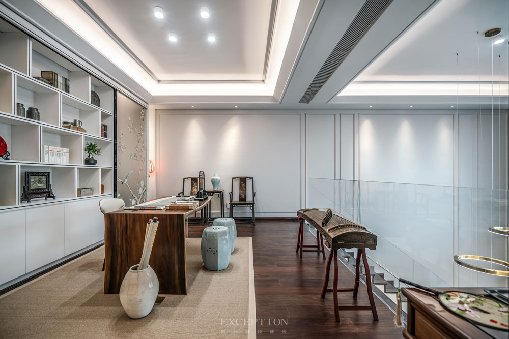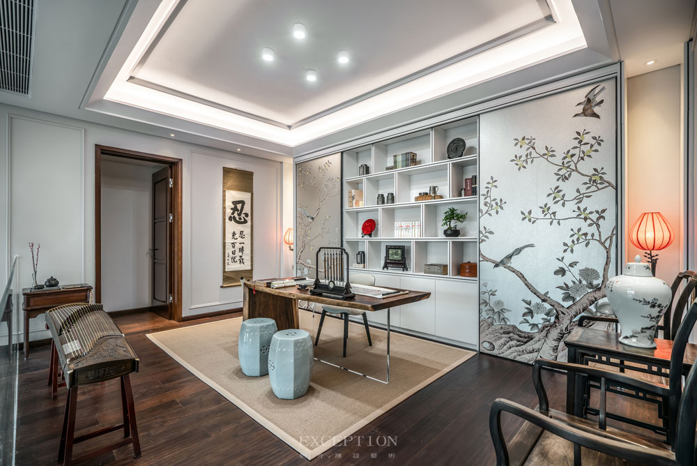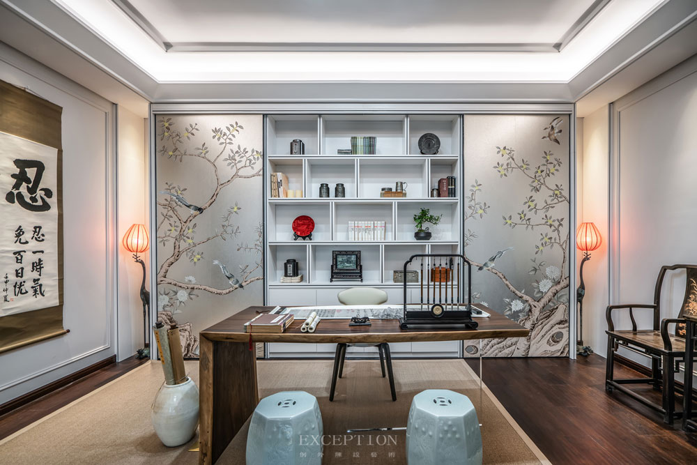 花鳥元素毫無保留地延續(xù)到書房,一體式立面收藏柜在滿足實用性需求的同時,賦予空間豐富而又飽滿的層次感。優(yōu)雅的鶴型落地?zé)羯l(fā)出溫熙的橘色光芒,鶴伴鳴琴,花鳥相望。在這里,居者熱情大度地展示著自己的日常喜好。撫琴輕攏慢捻、信手揮毫潑墨、細(xì)嗅墨韻書香,充滿生活氣息的場景如同文藝電影,慢慢講述,細(xì)水流長。