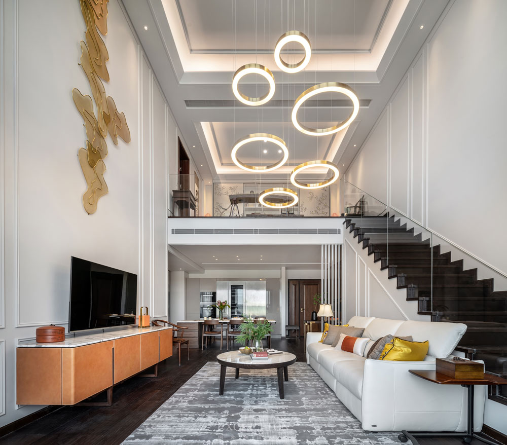 客廳以一種不太對稱的姿態(tài)進(jìn)入視野,但這并不妨礙設(shè)計師的設(shè)計與構(gòu)思,挑高的層空給予設(shè)計更寬容的尺度。在東方美學(xué)不斷被議起的今天,墻面上升騰而起的金色祥云,古樸圓潤的圈椅,喜慶熱烈的橙色系軟飾,都在傳遞開放融合的氣質(zhì),與現(xiàn)代極簡的線型吊燈共同譜寫空間的大氣靜遠(yuǎn)。