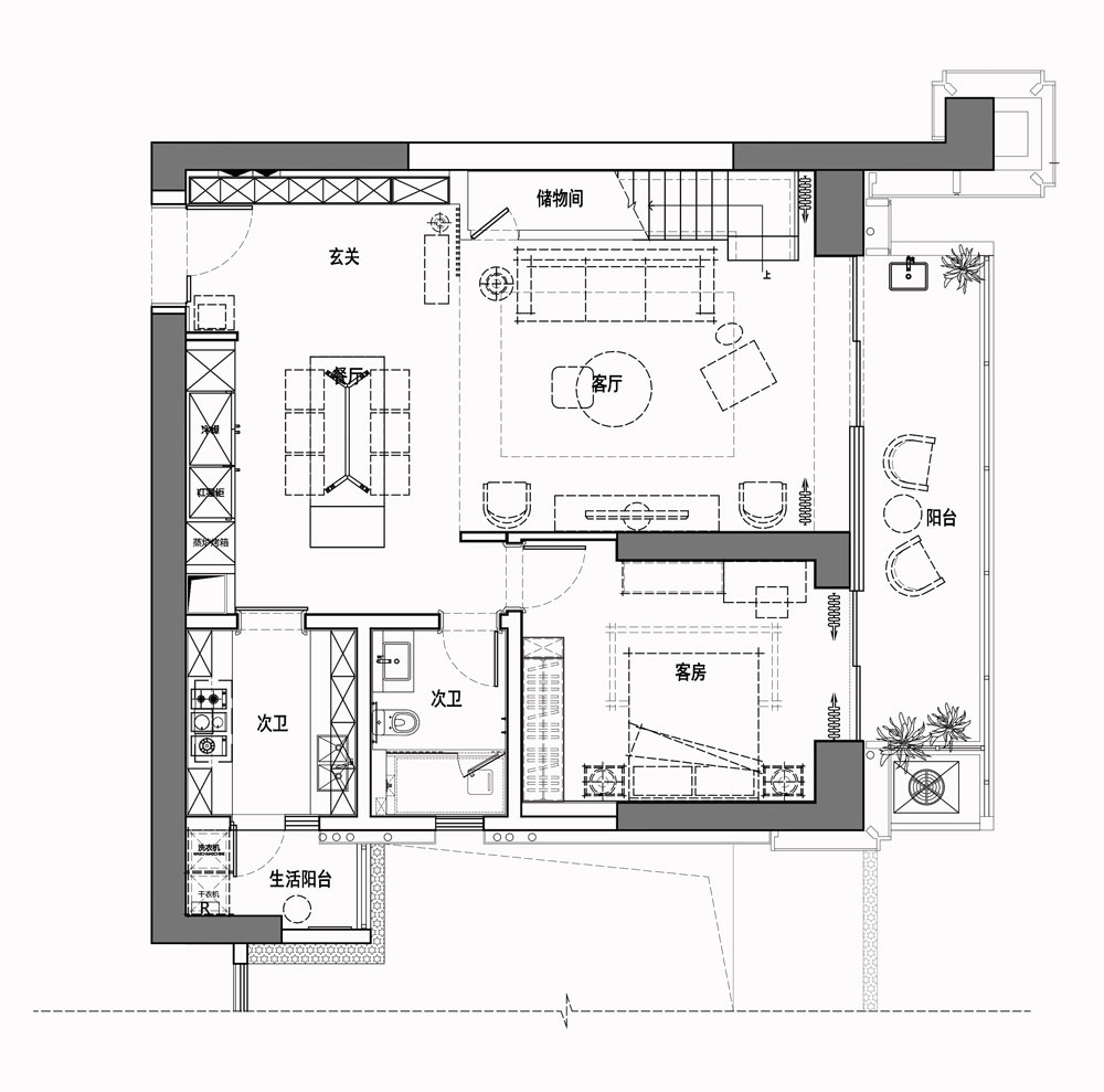 2、彌補了原戶型采光不足的缺陷,同時擴(kuò)大了餐廳的面積,并充分利用好樓梯下方空間打造了一個儲物間,增加了儲物功能。