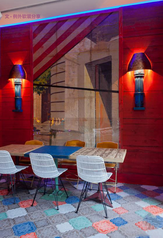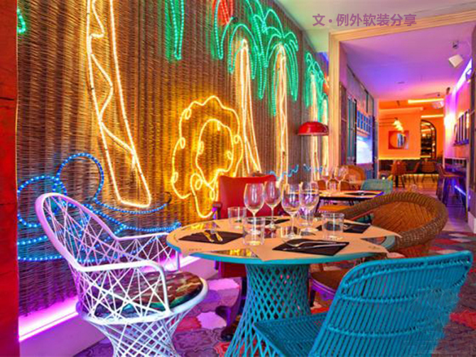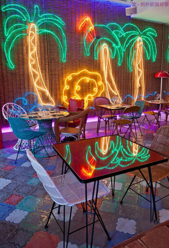 Bananas以椰子樹(shù)與芭蕉樹(shù)為主要元素,力求營(yíng)造一種類(lèi)似熱帶海濱小鎮(zhèn)的氛圍。餐廳墻壁上或手繪芭蕉葉子,墻上那只獵豹好像是在Blanca Ruiz de 別墅和Alejandra Basso的壁畫(huà)上穿梭捕食?;虿捎锰倬幑に嚢鼔γ?,或采用原生態(tài)木板飾面,各有特色,不盡相同,效果十分豐富。另一大亮點(diǎn)在于五彩繽紛的霓虹燈,將燈泡排列成棕櫚樹(shù)、海浪的形狀,鮮艷奪目的色彩為進(jìn)餐帶來(lái)另類(lèi)的新奇感受。