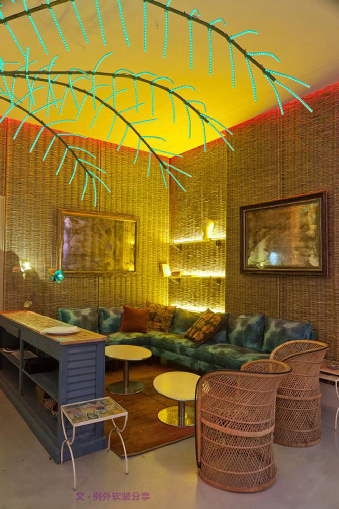 此外,獨(dú)特的飾品也為餐廳增色不少,棕櫚樹(shù)雕塑,掛著加勒比樣式的鐵鼓,在棕櫚樹(shù)葉子的掩蓋下,大部分的家具和配飾都是50年代的古董物件,比如從一艘舊船上搶救出來(lái)的桌子,編織鏤空座椅傳達(dá)出濃郁的熱帶風(fēng)情,原始自然氣息。