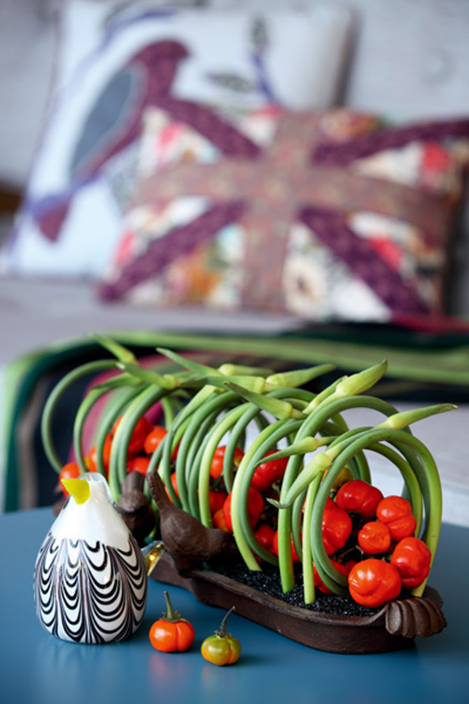 利用蒜薹良好的柔韌性,窩成拱廊狀,再配以火紅的南瓜茄,好似花園深處的一條長(zhǎng)廊,并且南瓜茄觀果期長(zhǎng)達(dá)半年之久,是很好的花藝材料。