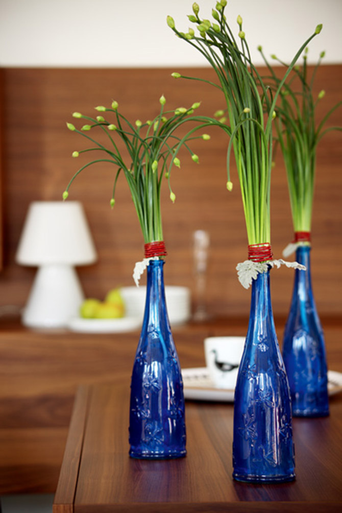 從未想過(guò)蒜薹也可以這樣婀娜吧?這就是花藝的魅力。以銀葉菊葉片為輔助花材,將蒜薹用紅水木枝捆扎成型,插入花瓶。如果只是一只花瓶看起來(lái)稍顯孤單,不妨三只一起就很有氣氛。蒜薹在制作之前好整體先用水浸泡吸足水分,否則插入后會(huì)很容易疲軟,而丟失挺拔之勢(shì)。