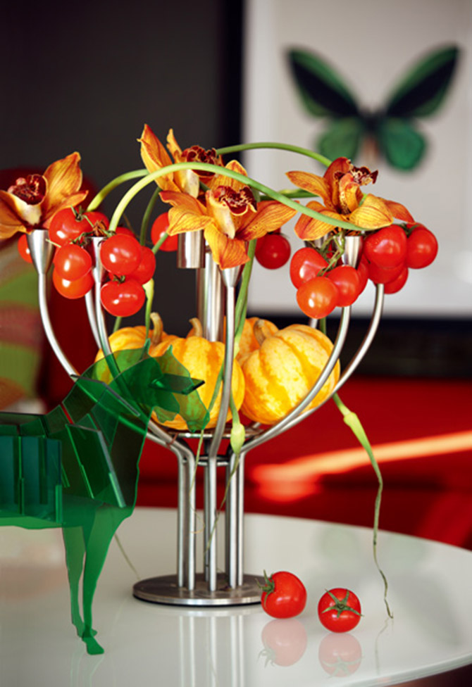 不銹鋼燭臺(tái)因?yàn)橛辛伺{(diào)的花材、食材相伴,不再冷清,即使沒(méi)有蠟燭,也能感受到如火的熱情。用大花蕙蘭模擬燭光,以櫻桃番茄模擬滴落的燭淚,蒜苗悠然地游走其中,袖珍南瓜壓住陣腳,這樣的熱情,你怎能拒絕得了。