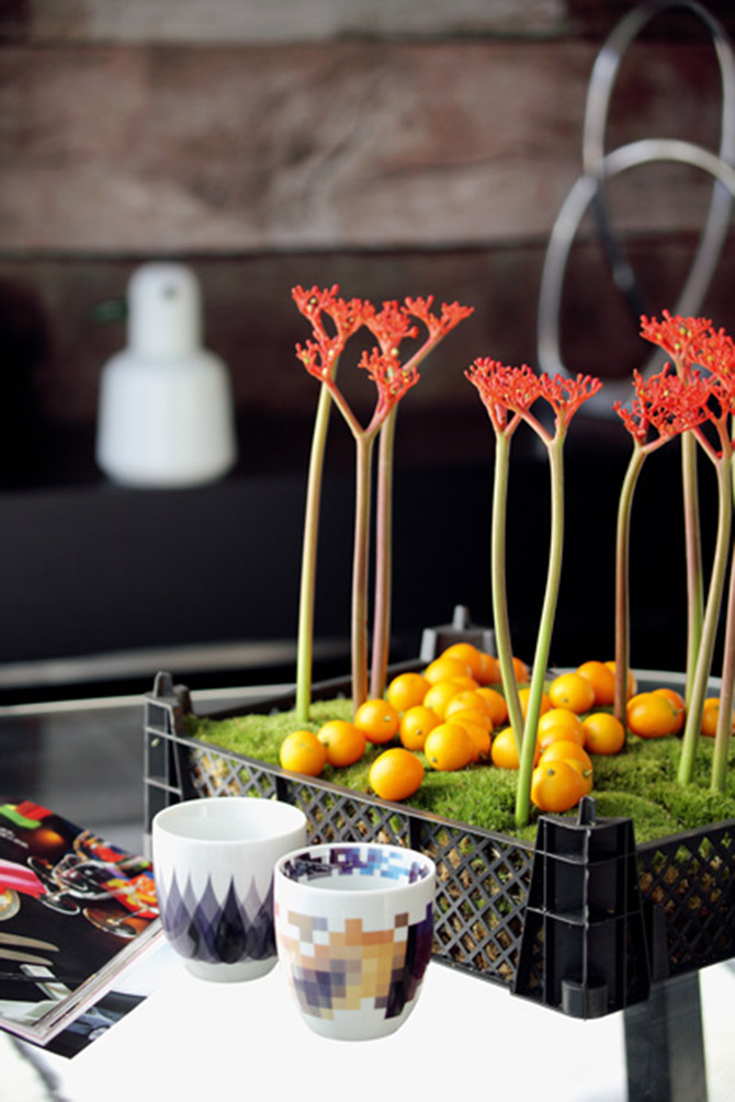再普通不過(guò)的塑料小筐,鋪上蒼翠的青苔后就立刻有了茫茫的草原之態(tài),金橘自由隨意地散落其上,閃爍著金色的光澤,紅色的風(fēng)輪花花枝纖細(xì)修長(zhǎng),這樣的插花擺在桌上富有節(jié)日的氣息。