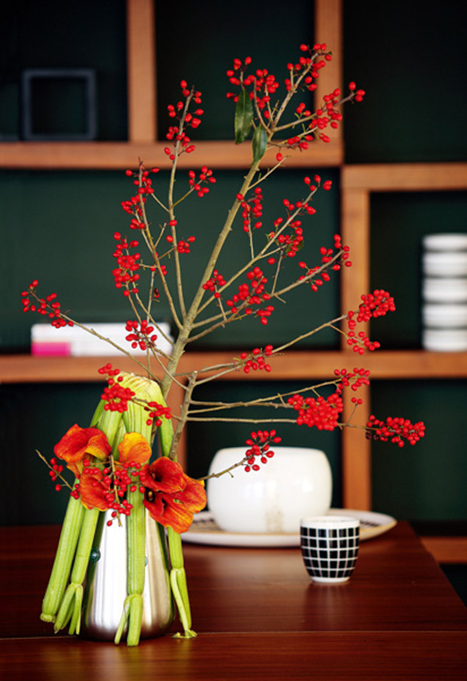 新鮮的西芹打開(kāi)倒扣在任何一個(gè)高度適宜的容器上,就形成了漂亮的傘形,紅花馬蹄蓮可以直接插入西芹的莖稈,折一枝冬青果依偎在側(cè),頗有寫意之風(fēng)。
