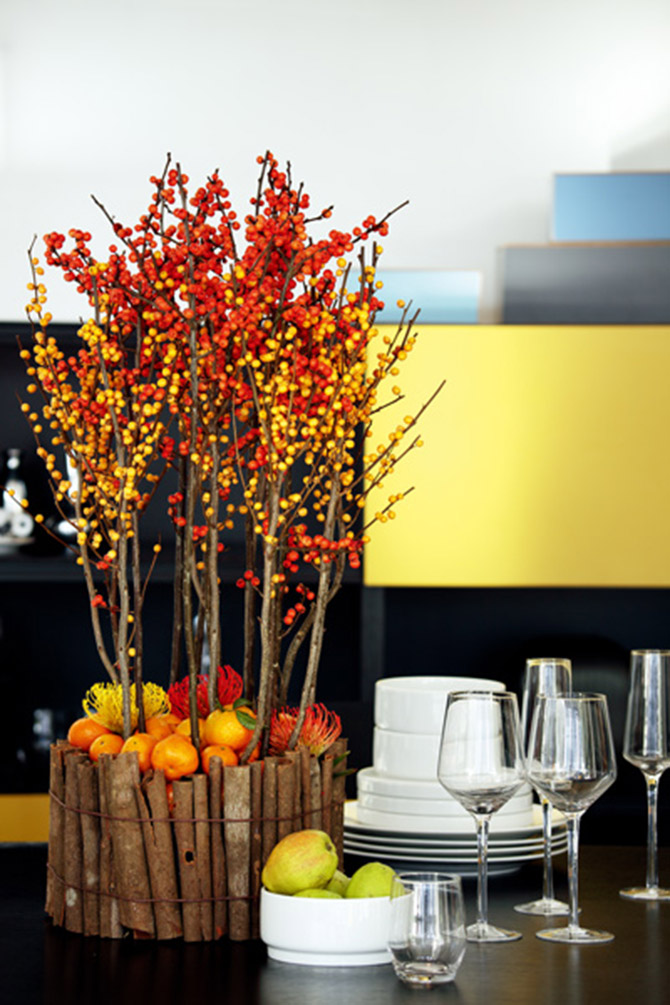 令人驚喜的是秋冬時(shí)節(jié)還能剩下這樣色彩奪人注目的果實(shí),非常適合作為插花的花材,果實(shí)飽滿圓潤(rùn)的美麗一點(diǎn)也不輸花朵。這組插花的妙處還在于花器的組裝,用樹(shù)皮般粗糙的肉桂棒圍繞而成,質(zhì)樸無(wú)華更映襯出花果的鮮艷。針墊花在這里儼然成了樹(shù)林中的灌木叢,這樣的作品擺放在餐桌上讓人食欲大增。