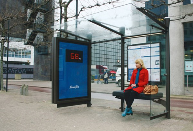 位于荷蘭的創(chuàng)意公交站,將座位和電子秤、顯示屏幕相連。只要坐上去,旁邊的屏幕上就會顯示出你的體重。這一創(chuàng)意不但給等車的人們帶來樂趣,而且與健身運動主題廣告結(jié)合。但是,這樣的創(chuàng)意不一定受到女士的喜歡吧??吹首由献溶嚨哪莻€婦人,天?。?8KG,她一定覺得自己超重了!