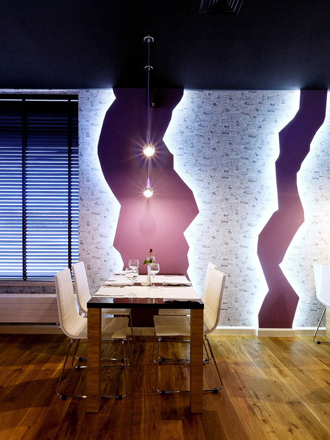 Wamhouse在此前的項目中就使用過紙張撕痕的設計手法,在這里算是駕輕就熟,前廳的墻壁整面鋪上以報紙為主題的墻紙,并在適當?shù)牡胤接脕喛肆Π逶O置凸面,以安放燈具,從而達到只見光不見燈的效果。燈帶亮起,墻壁看起來就像撕碎的“報紙”,中間夾雜著深紫色的縫隙,形成難以言喻的光影錯覺,襯托出墻壁參差不齊的輪廓。