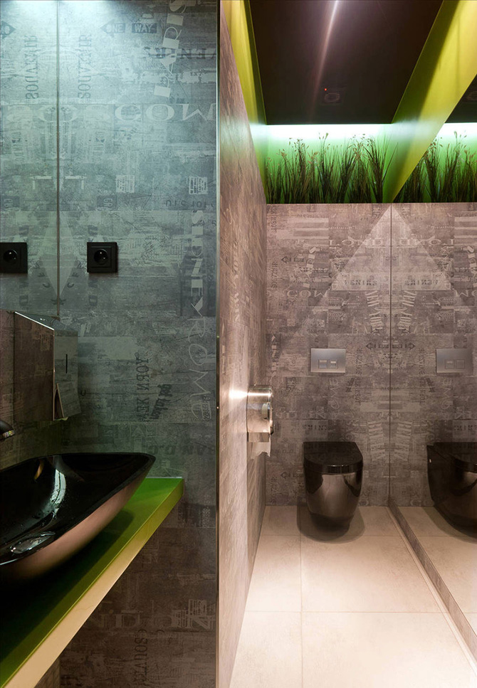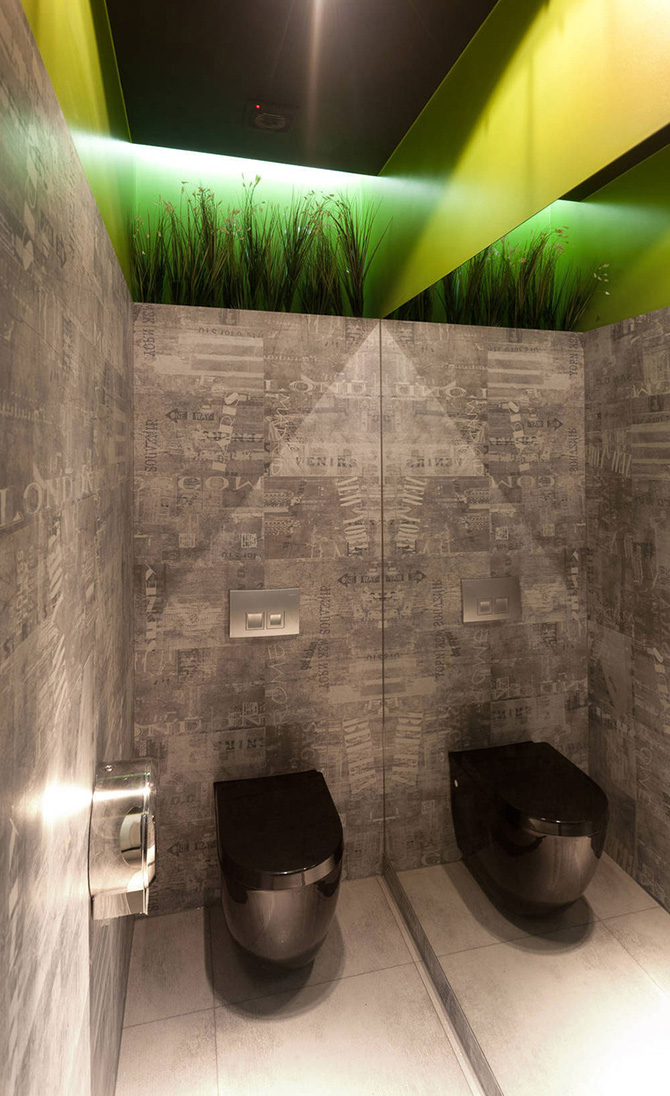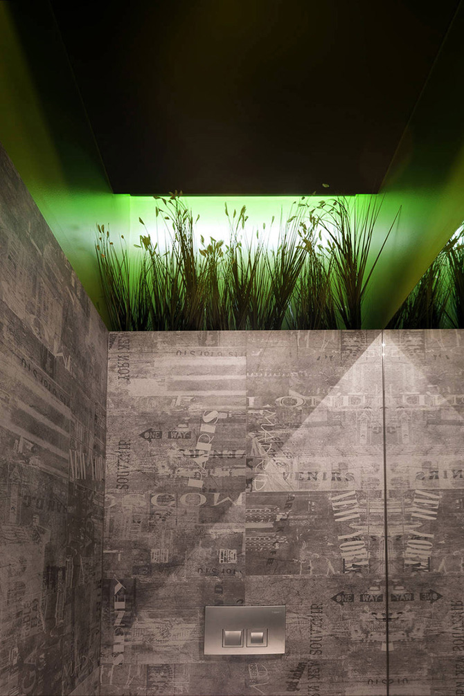 餐桌使用天然橡木打造成簡明利落的現(xiàn)代風格,原木色和白色構(gòu)成了整個就餐區(qū)的主色調(diào)。休息室內(nèi)不僅有報紙裝飾,還有印著很多城市名字的灰色巖石瓦片。在衛(wèi)生間的裝飾中,設計師用玫粉來裝飾女士洗手間,用石灰綠來裝飾男士洗手間。隨處可見擺放的綠植,使得餐廳的整體氣氛更加優(yōu)雅且富有活力。