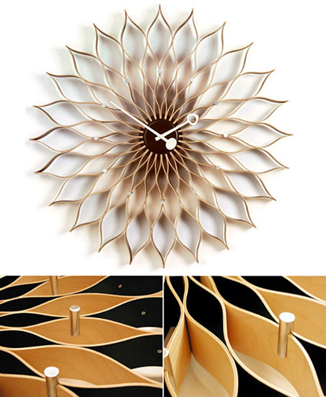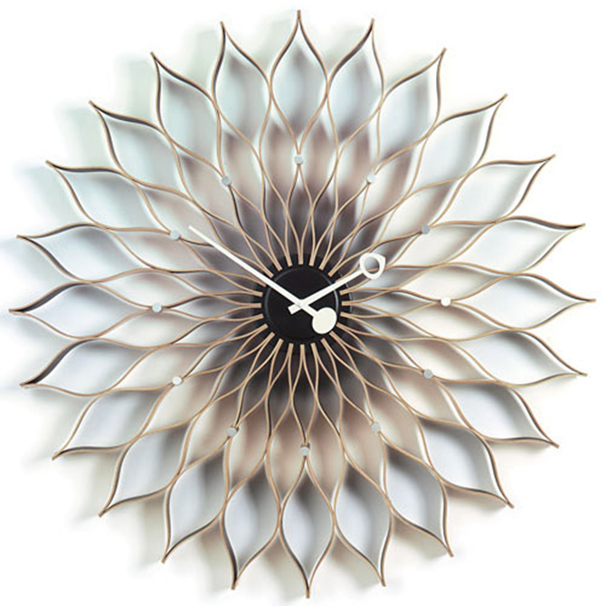 這款名為Sunflower(太陽(yáng)花)的掛鐘至今仍在生產(chǎn),木片彎成的花瓣細(xì)致美麗,好似墻壁上盛放的一朵太陽(yáng)花,流露作者對(duì)自然的熱愛。Sunflower clock用白樺木和上漆金屬制成的鐘面大氣而壯觀,直徑75cm,盡管價(jià)格不菲,還是很難讓人不被向日葵的別致造型所打動(dòng)