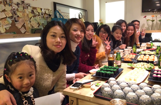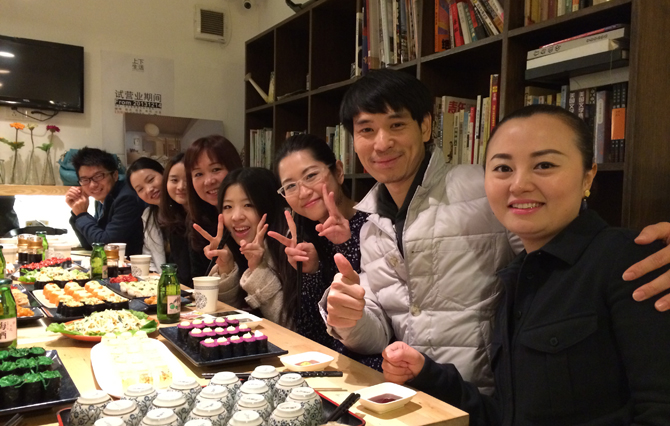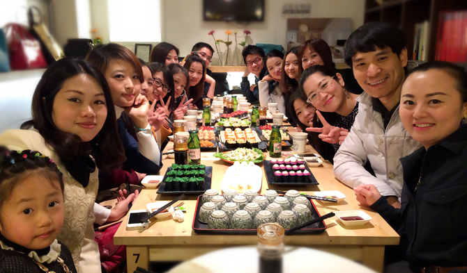 18日傍晚,例外軟裝全體成員及鴻藝源設(shè)計,精心妝扮、靚裝出席年會站——上下生活(由一對80后建筑師小夫妻創(chuàng)辦壽司店)聚餐。略顯狹小卻倍感溫馨的閣樓,瞬間被我們的歡聲笑語鬧開了。色澤鮮亮、精致鮮美的各色壽司徹底勾起了大家的食欲:三文魚、蟹子卷、八爪魚、海蜇絲、鮮蝦壽司、紫菜包飯、蔬菜色拉等等讓人垂涎欲滴,迫不及待操起筷子大快朵頤,鮮美的壽司配上芥末醬,入口鮮香辛辣;細細咀嚼,一絲酸甜,千百種滋味在味蕾綻放,再配以甘洌的青梅酒,清酸和軟回味無窮,讓人欲罷不能……