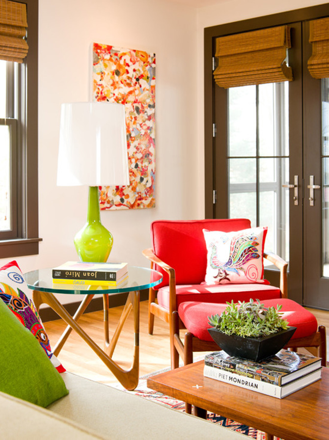 你可以把電影里的靈感直接運(yùn)用過(guò)來(lái),冷色調(diào)的翠綠造成視覺(jué)上的后退感,令空間擴(kuò)大而富有層次,鮮紅色沙發(fā)像兩朵盛放的玫瑰,熱烈而醒目,整個(gè)空間在這兩種色彩的碰撞下極富活力。