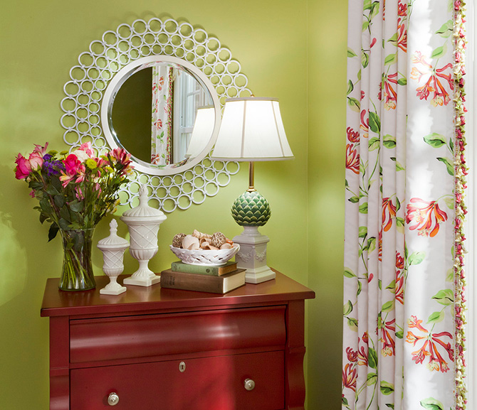 紅綠搭配當(dāng)然不止朱紅與翠綠的“重口味”方案,在粉藍(lán)色的背景下繪制桃紅與果綠能營(yíng)造出田園的輕巧與浪漫。