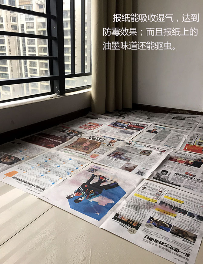 每天早上擠地鐵不是白擠的,我都會帶一份報紙回來,終于等到回南天了,我把滿屋子地上鋪滿報紙,吸附地面上的水珠妥妥的!親!衣柜底下,沙發(fā)底下也不要放過哦!親!報紙上的油墨有很好的吸水效果呢!親!報紙防潮,不產生任何成本,你值得擁有!