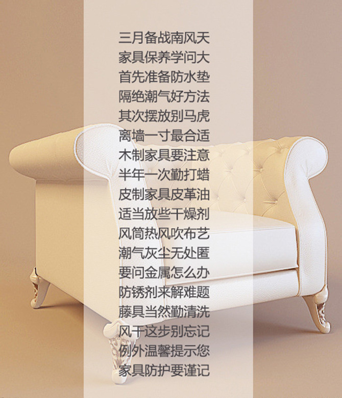 大家肯定非常關心家具的保養(yǎng)防護,這里小編寫了一個順口溜,雖然不太押韻,但是很實用哦O(∩_∩)O~